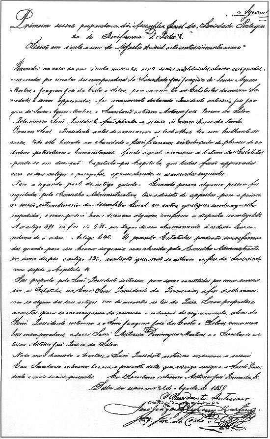 estatutos e fundação da entidade - ato realizado na residência do sr. José Joaquim de Souza Ayhram Martins, na Rua Direita, 20 (depois rebatizada