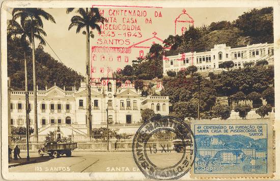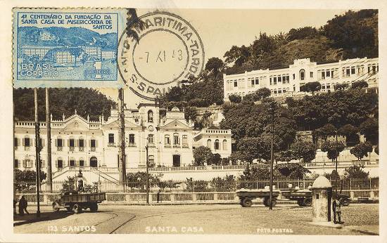 Santa Casa, com o selo comemorativo de seu quarto centenário, em postal com carimbo de transporte por via marítima em 7 de novembro de 1943 - correio da tarde