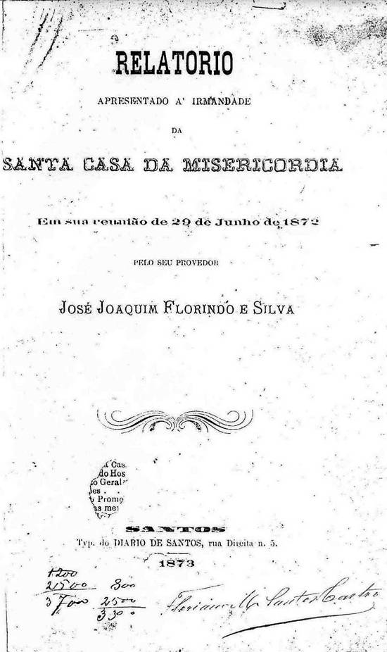 Capa do relatório apresentado à Irmandade pelo seu provedor José Joaquim Florindo e Silva, em 29 de junho de 1872, com impressão em 1873 pela tipografia do jornal Diário de Santos
