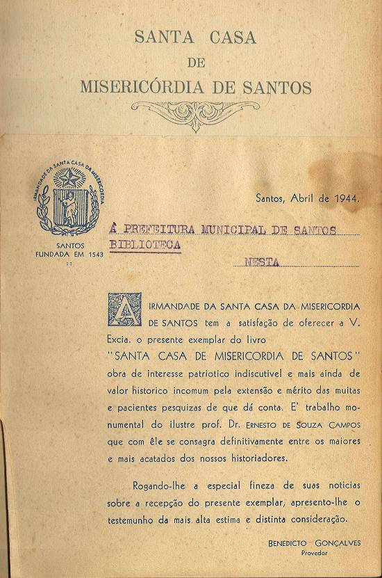 exemplar da obra foi ofertado em 1944 pela Irmandade da Santa Casa à Biblioteca Municipal de Santos, depois denominada