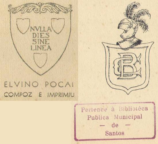 das páginas 140 e 141: marca do impressor à esquerda, brasão de Braz Cubas à direita, carimbo da Biblioteca Pública Municipal em 1943