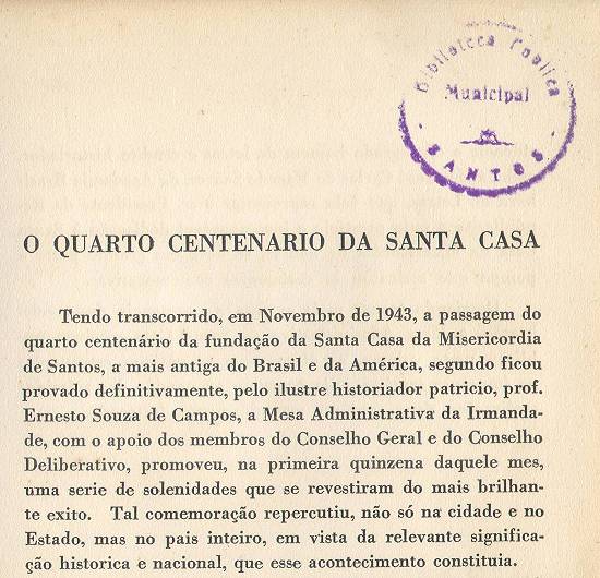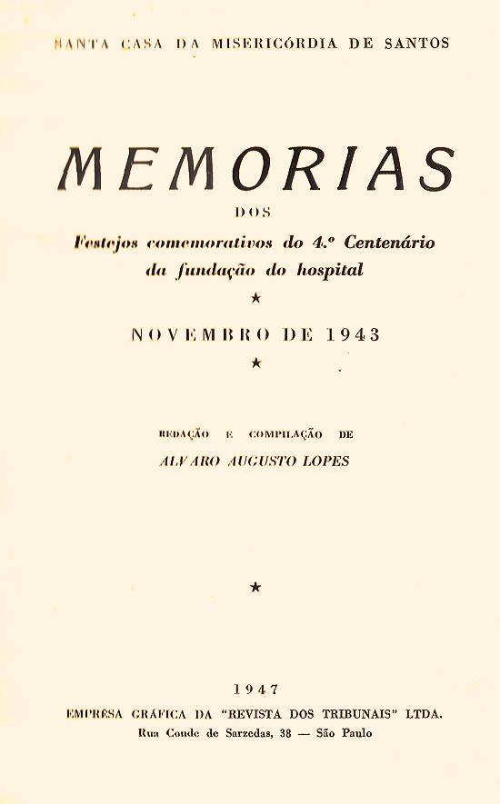Comemorativos do 4º Centenário da Fundação da Santa Casa de Misericórdia de Santos - Novembro de 1943. A obra de 235 páginas foi impressa na Empresa