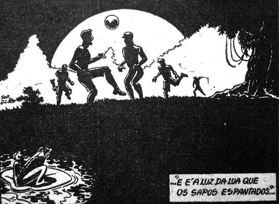 vez, os sapos, espantados, vêem correr para cá, para lá, dois bandos de rapazes, atrás de uma bola enrolada em pano branco. As nuvens, de quando em