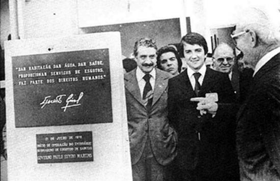 logo abaixo: "21 de julho de 1978 - início de operação do Emissário Submarino de Esgotos de Santos - Governo Paulo Egydio Martins".