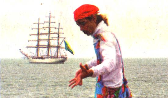 Malabarista com pinta de pirata fez truques diante do Cisne Branco