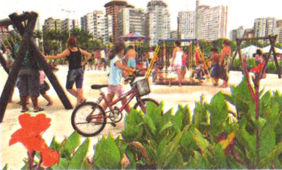de cooper, ciclovia, bicicletário, gibiteca, escolinha de surfe e play-ground |