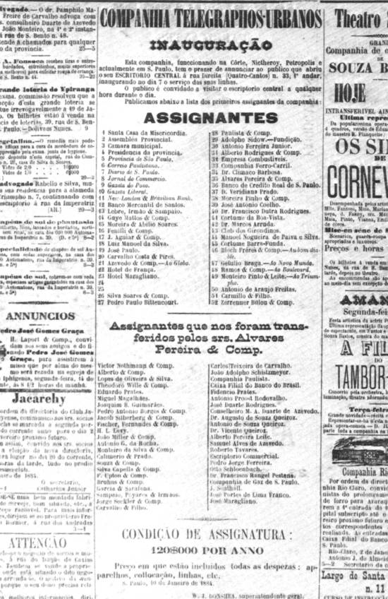 assinantes. O número de aparelhos simplesmente quadruplicou num espaço de tempo mínimo. Essa segunda lista inclui 45 assinantes da Álvares Pereira & Companhia, empresa que a princípio disputa com a Telégraphos Urbanos o direito de explorar os