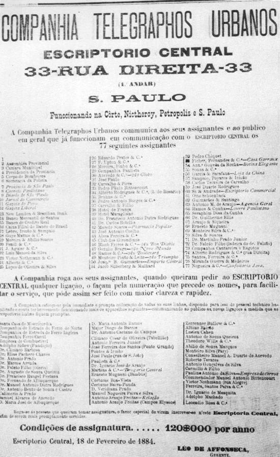 A PRIMEIRA LISTA - Um dia após a inauguração dos serviços telefônicos em São Paulo, a Companhia Telégraphos Urbanos emite sua primeira lista de aparelhos. Ela era composta de 22 assinantes, entre os
