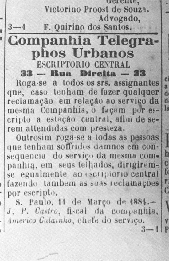 Imagem: anúncio da Companhia Telégraphos Urbanos em O Correio Paulistano. Acervo do Arquivo do Estado