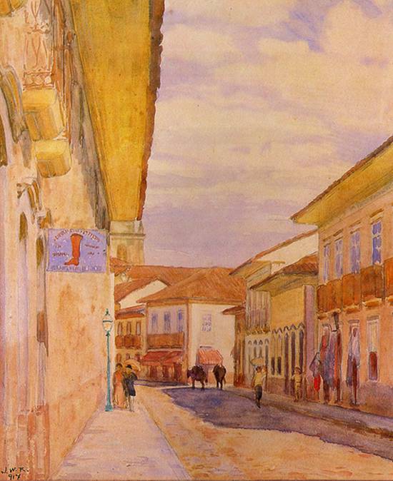 JOSÉ WASTH RODRIGUES - Rua Direita (1860), sem data (N.E.: na tela consta o ano 1917), aquarela 30x25 cm, acervo do Museu Paulista
