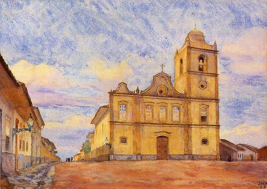 JOSÉ WASTH RODRIGUES - Igreja e Largo de Santa Ifigênia (1864), 1918 (N.E.: na tela consta a data 1917), aquarela 49x39 cm, acervo do Museu Paulista