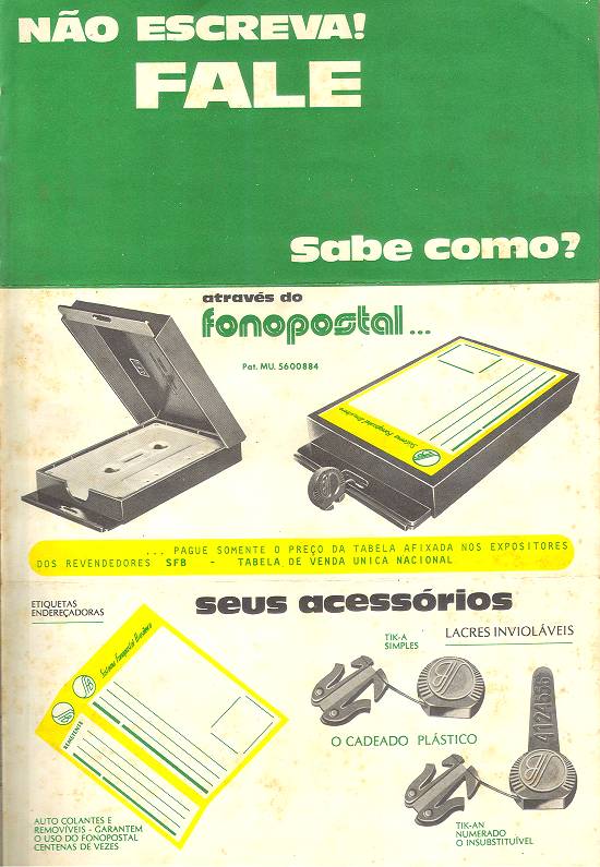 Há, porém, outras despesas: a fita cassete, que pode ser qualquer uma, ou a vendida nos postos do fonopostal (para gravações de 40 minutos, Cr$ 45,00; de 30 minutos, Cr$ 42,00; de 20, Cr$ 35,00); a