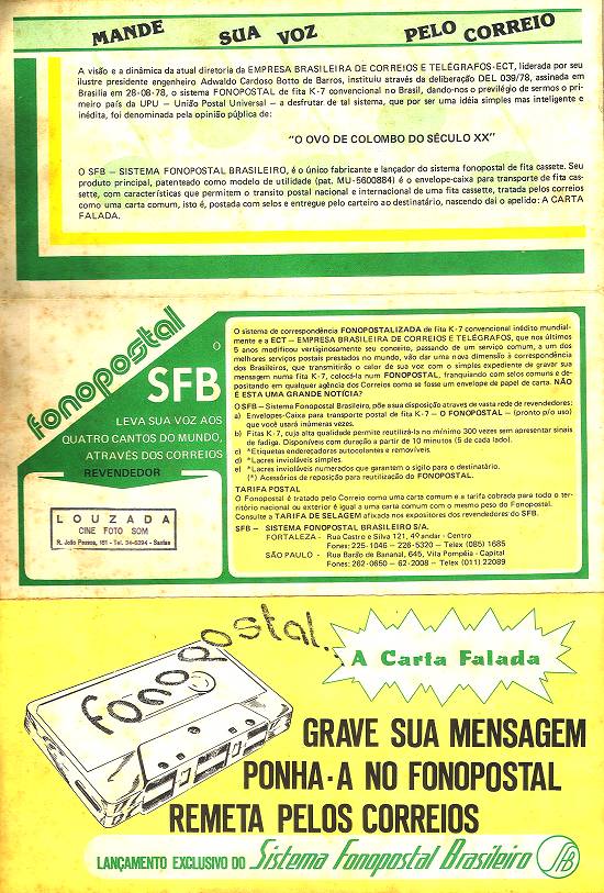 tempo. Também poderia servir para o envio de fitas com gravações de músicas, espetáculos, músicas para concursos de calouros, e outras finalidades.