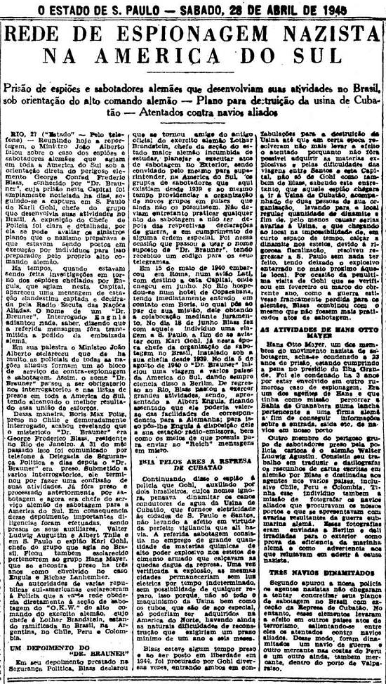 RIO, 27 ("Estado" – Pelo telefone) – Reunindo hoje a reportagem, o ministro João Alberto falou sobre o caso dos espiões e sabotadores alemães que agiam em toda a América do Sul sob a orientação direta do perigoso elemento George Conrad Frederic Blass, conhecido por "Dr. Brauner", cuja prisão nesta Capital foi amplamente noticiada há dias, seguindo-se a captura em S. Paulo de Karll Gohl, chefe do grupo que desenvolvia suas atividades no Brasil. A exposição do chefe de Polícia foi clara e detalhada, por ela se ode avaliar os sinistros planos que o nazismo preparava e que estavam sendo postos em execução por indivíduos para isso preparados pelo próprio alto comando alemão.