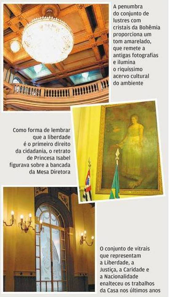 primeiro direito da cidadania, o retrato de princesa Isabel figurava sobre a bancada da Mesa Diretora O conjunto de vitrais que representam a