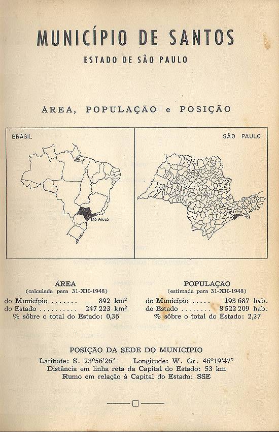 Estatística do Município de Santos - Estado de São Paulo, com 78 páginas e uma planta cartográfica regional, de que resta um exemplar