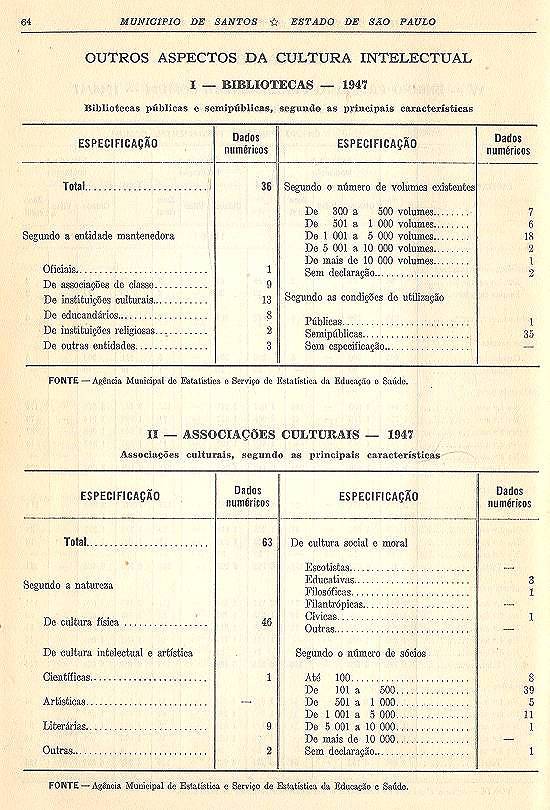 Estatística do Município de Santos - Estado de São Paulo, com 78 páginas e uma planta cartográfica regional, de que resta um exemplar
