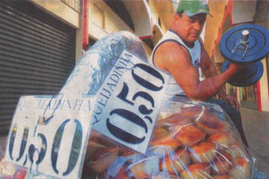 Centro, carrega pelo menos uns 50 quilos: 30 da cesta com as queijadinhas e mais 20 de um peso de halterofilismo que carrega consigo.