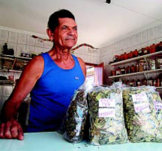 O comerciante manipula cerca de 200 tipos de ervas em sua loja...
