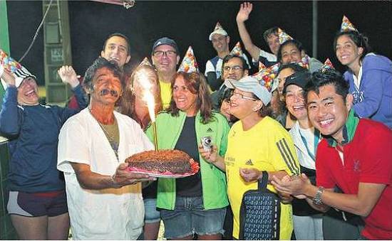 Dezessete pessoas com chapéu de aniversário, apito na boca e um bolo nas mãos surpreenderam Belchior, que não teve vergonha de chorar e dizer que