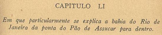É tamanha coisa o Rio de Janeiro da boca para dentro, que nos obriga a gastar o tempo em o declarar neste lugar, para que se veja como é capaz de se fazer mais conta dele do que se faz. E comecemos do Pão de Açúcar, que está da banda de fora da barra, que é um pico de pedra mui alto, da feição do nome que tem, do qual, à ponta da barra, que se diz de Cara de Cão, há pouco espaço; e a terra, que fica entre esta ponta e o Pão de Açúcar, é baixa e chã; e virando-se desta ponta para dentro da barra se chama Cidade Velha, onde se ela fundou primeiro.