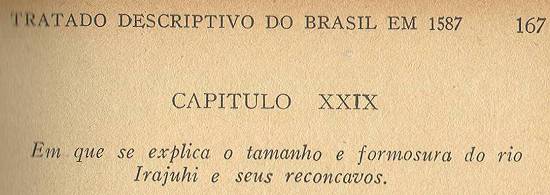 E tornando ao outro esteiro que fica da outra banda do Rio Irajuí, onde se mete a ribeira que se diz de Jaceru, com a qual mói outro engenho que agora novamente fez o mesmo Diogo Correia, o qual está mui bem acabado e aperfeiçoado com as oficinas necessárias; todo este esteiro está povoado de fazendas de moradores com formosos canaviais; e descendo por este rio abaixo ao longo da terra da mão direita, andando mais de uma légua, vai a terra povoada da mesma maneira, onde este rio é como o Tejo de Vila Franca para cima.