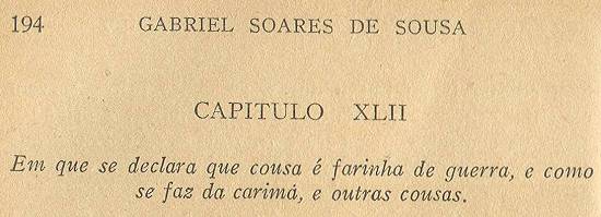 Desta farinha-de-guerra usam os portugueses que não têm roças, e os que estão fora delas na cidade, com que sustentam seus criados e escravos, e nos engenhos se provêm dela para sustentarem a gente em tempo de necessidade, e os navios que vêm do Brasil para estes reinos não têm outro remédio de matalotagem, para se sustentar a gente até Portugal, senão o da farinha-de-guerra; e um alqueire dela da medida da Bahia, que tem dois de Portugal, se dá de regra a cada homem para um mês, a qual farinha-de-guerra é muito sadia e desenfastiada, e molhada no caldo da carne ou do peixe fica branda e tão saborosa como cuscuz.