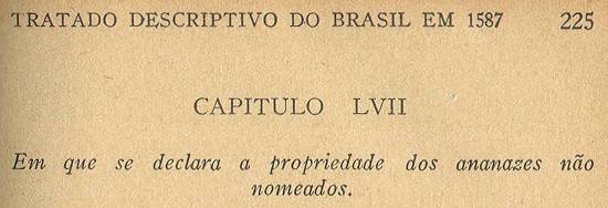 A erva em que se criam os ananases é da feição da que em Portugal chamam erva-babosa, e tem as folhas armadas, e do tamanho da erva-babosa, mas não são tão grossas; a qual erva ou ananaseiro espiga cada ano no meio como cardo, e lança um grelo da mesma maneira, e em cima dele lhe nasce o fruto, tamanho como alcachofra, muito vermelho, o qual assim como vai crescendo, vai perdendo a cor e fazendo-se verde; e como vai amadurecendo, se vai fazendo amarelo acataçolado de verde, e como é maduro conhece-se pelo cheiro, como o melão.