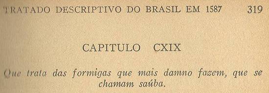 Muito havia que dizer das formigas do Brasil, o que se deixa de fazer tão copiosamente como se poderá fazer, por se escusar prolixidade; mas diremos em breve de algumas, começando nas que mais dano fazem na terra, a que o gentio chama ussaúba, que é a praga do Brasil, as quais são como as grandes de Portugal, mas mordem muito e onde chegam destroem as roças de mandioca, as hortas de árvores da Espanha, as laranjeiras, romeiras e parreiras.