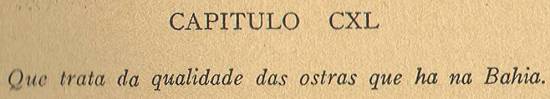 E há tantas ostras na Bahia e em outras partes, que se carregam barcos delas, muito grandes, para fazerem cal das cascas, de que se faz muita e muito boa para as obras, a qual é muito alva; e há engenho que se gastou nas obras dele mais de três mil moios [medida antiga de capacidade equivalente a 60 alquires ou 828 litros, em Lisboa] de cal destas ostras; as quais são muito mais sadias que as da Espanha.