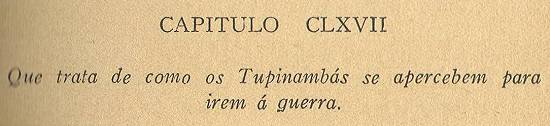 Como os tupinambás são muito belicosos, todos os seus fundamentos são como farão guerra aos seus contrários; para o que se ajuntam no terreiro da sua aldeia as pessoas mais principais, e fazem seus conselhos, como fica declarado; onde assentam a que parte hão de ir dar a dita guerra, e em que tempo; para o que se notifica a todos que se façam prestes de arcos e flechas, e alguns paveses [escudos], que fazem de um pau mole e muito leve, e as mulheres entendem em lhes fazerem a farinha que hão de levar, a que chamam de guerra; porque dura muito, para se fazer a dita guerra, de onde tomou o nome; e como todos estão prestes de suas armas e mantimentos, às noites antes da partida anda o principal pregando ao redor das casas, e nessa pregação lhes diz onde vão, e a obrigação que têm de ir tomar vingança de seus contrários, pondo-lhes diante a obrigação que têm para o fazerem e para pelejarem valorosamente; prometendo-lhes vitória contra seus inimigos, sem nenhum perigo da sua parte, de que ficará deles memória para os que após eles vierem cantar em seus louvores; e que pela manhã comecem de caminhar.