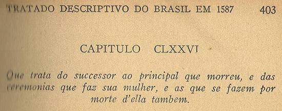 Costumam os tupinambás, quando morre o principal da aldeia, elegerem entre si quem suceda em seu lugar, e se o defunto tem filho que lhe possa suceder, a ele aceitam por seu cabeça; e quando não é para isso, ou o não tem, aceitam um seu irmão em seu lugar; e não os tendo que tenham partes para isso, elegem um parente seu, se é capaz de tal cargo, e tem as partes atrás declaradas.
