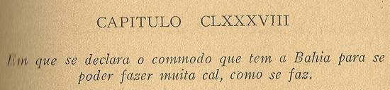A maior parte da cal que se faz na Bahia é das cascas das ostras, de que há tanta quantidade que se faz dela muita cal, a que é alvíssima, e lisa também, como a de Alcântara; e fazem-se dela guarnições de estuque mui alvas e primas; e a cal que se faz das ostras é mais fácil de fazer que a de pedras; porque gasta pouca lenha e com lhe fazerem fogo que dure dez, doze horas, fica muito bem cozida, e é tão forte que se quer caldeada, e ao caldear ferve em pulos como a cal de pedra de Lisboa.