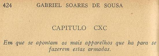 Clique na imagem para voltar ao índice desta obraEscrita em 1587 pelo colono Gabriel Soares de Souza, essa obra chegou ao eminente historiador Francisco Adolpho de Varnhagen por cópias que confrontou em 1851, para tentar restabelecer o texto original desaparecido, como cita na introdução de seus estudos e comentários. Em 1974, foi editada com o mesmo nome original, Notícia do Brasil, com extensas notas de importantes pesquisadores. Mais recentemente, o site Domínio Público apresentou uma versão da obra, com algumas falhas de digitalização e reconhecimento ótico de caracteres (OCR).