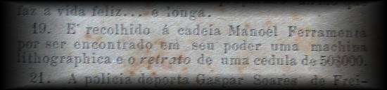 19. É recolhido à cadeia Manoel Ferramenta por ser encontrado em seu poder uma máquina litográfica e o retrato de uma cédula de 50$000.