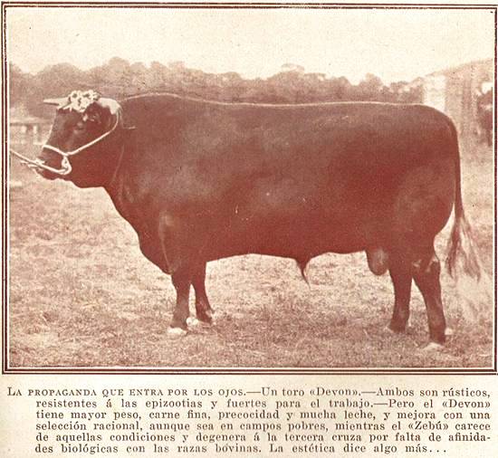 RAÇAS BOVINAS PARA O BRASIL - A propaganda que entra pelos olhos - Um touro Devon - Ambos são rústicos, resistentes às epizootias  fortes para o trabalho. Mas o Devon tem maior peso, carne fina, precocidade e muito leite,  melhora com uma seleção racional, ainda que seja em campos pobres, enquanto o Zebu carece daquelas condições e degenera ao terceiro cruzamento por falta de afinidades biológicas com as raças bovinas. A estética diz algo mais...