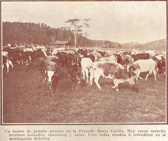 Precisamente em umas horas roubadas ao itinerário, conheci nesse estado – Rio de Janeiro – um domínio senhorial, Santa Cecília, do doutor Rodrigues Peixoto – formado pela reunião de várias antigas fazendas de café, e vi ali, sobre a base de 500 cabeças bovinas com boas mestiçagens de Schwitz e tendo já em serviço vários formosos reprodutores puros dessa raça, cujos bezerros de primeiro cruzamento obtêm a forma e a pelagem característico do bom sangue que trazem; sendo de notar ademais que nenhum dos vários exemplares Schwitz importados por esta fazenda sofreu enfermidade nem atraso algum grave.