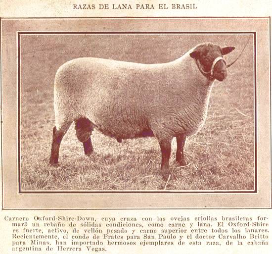 RAÇAS DE LÃ PARA O BRASIL - Carneiro Oxford-Shire-Down, cujo cruzamento com as ovelhas crioulas brasileiras formará um rebanho de sólidas condições, como carne e lã. O Oxford-Shire é forte, ativo, de pelagem pesada e carne superior entre todos os laníferos. Recentemente, o conde de Prates para São Paulo e o doutor Carvalho Britto para Minas, importaram formosos exemplares desta raça, da vivenda argentina de Herrera Vegas