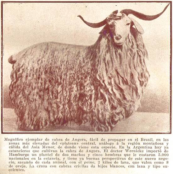 RAÇAS DE LÃ PARA O BRASIL - Magnífico exemplar de cabra de Angorá, fácil de propagar no Brasil, nas zonas mais levadas do platô central, análogo à região montanhosa e quente da Ásia Menor, de onde vem sta espécie. Na Argentina há estancieiros que cultivam a cabra de Angorá. O doutor Wernick importou de Hamburgo um plantel de dois machos e cinco fêmeas que lhe custaram 5.000 nacionais na estância, e tem já boas perspectivas deste novo negócio, sacando de cada animal, com o cardamento, 2 quilos de lã, que valem como 8 de ovelha. O cruzamento com cabras crioulas dá filhos brancos, com lã e tipo excelentes