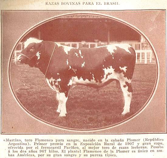 RAÇAS BOVINAS PARA O BRASIL - Martín, touro Flamenco puro-sangue, nascido na vivenda Plomer (República Argentina). Primeiro prêmio na Exposição Rural de 1907 e grande copa, oferecida pela ferrovia Pacífico ao melhor touro de raças leiteiras. Pesava aos dois anos 967 quilos. O plantel Flamenco da Plomer é único em ambas as Américas, por seu grande sangue e sua pureza típica