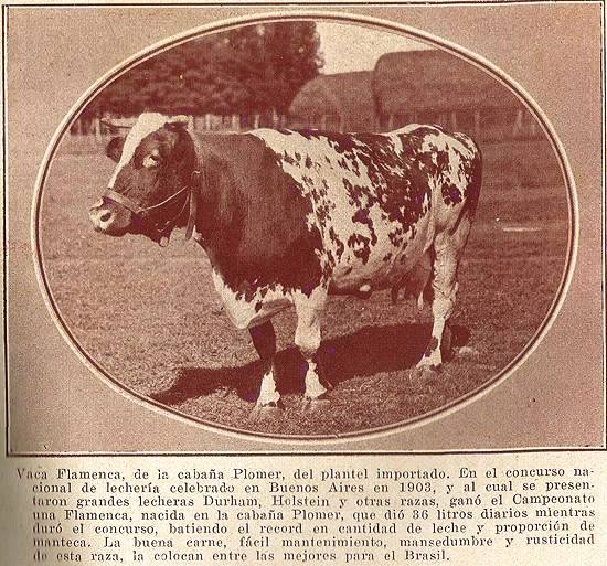 RAÇAS BOVINAS PARA O BRASIL - Vaca Flamenca, da vivenda Plomer, do plantel importado. No concurso nacional de leiteria celebrado em Buenos Aires em 1903, e ao qual se apresentaram grandes leiteiras Durban, Holstein e outras raças, ganhou o Campeonato uma Flamenca, nascida na vivenda Plomer, que deu 36 litros diários enquanto durou o concurso, batendo o recorde em quantidade de leite e proporção de manteiga. A boa carne, fácil manutenção, mansidão e rusticidade desta raça a colocam entre as melhores para o Brasil