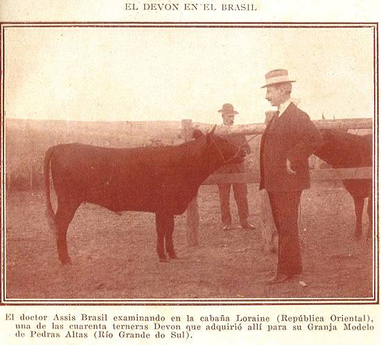 Destas três raças, a Schwitz, como disse, está já sendo provada em vários pontos; a Devon está ensaiada em Rio Grande, onde foi introduzida e cultivada com todo êxito pelo doutor Assis Brasil – que é um convincente propagandista de progressos agrários com o livro e com o fato, tendo-se convertido sua notável obra Cultura dos Campos em um evangelho inspirador e em um guia familiar para milhares de proprietários rurais do Brasil [1]; e pelo que faz à raça Flamenca, se imporá lá, quando for ensaiada, por sua precocidade, seu grande tamanho, sua força muscular, sua excelente condição para consumo e sua grande produção de leite, com gordura de 4 a 6 por cento, segundo a época do ano e a forragem.