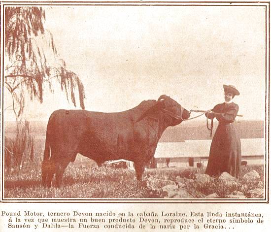O DEVON NO BRASIL - Pound Motor, novilho Devon nascido na vivenda Loraine. Este lindo instantâneo, ao mesmo tempo em que mostra um bom produto Devon, reproduz o eterno símbolo de Sansão e Dalila - a Força conduzida pelo nariz pela Graça...