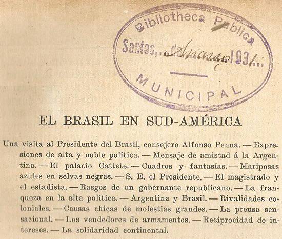 Uma visita ao presidente do Brasil, conselheiro Afonso Penna - Expressões de alta e nobre política - Mensagem de amizade à Argentina - O palácio Catete - Quadros e fantasias - Mariposas azuis em selvas negras - Sua Excelência o presidente - O magistrado e o estadista - Rasgos de um governante republicano - A franqueza na alta política - Argentina e Brasil - Rivalidades coloniais - Causas pequenas de moléstias grandes - A imprensa sensacionalista - Os vendedores de armamentos - Reciprocidade de interesses - A solidariedade continental