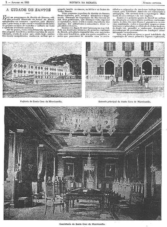 Justo é que iniciemos este retrospecto, feito de memória, e desacompanhado da mais insignificante nota, pela Santa Casa de Misericórdia, que pela sua importância, pelos serviços que presta aos infortunados, aos míseros deserdados da sorte, faz jus ao primeiro lugar e à saudação primeira. Esse estabelecimento é uma glória para a cidade de Santos e honra não só a ela, senão ao país inteiro.