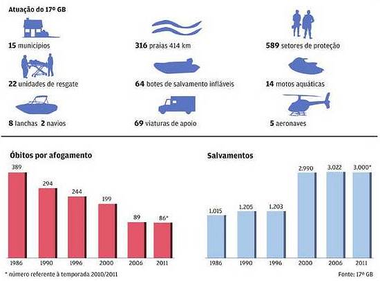 Já na temporada 2010/2011 foram aproximadamente 3 mil pessoas tiradas com vida da água. Inversamente, enquanto em 1995 foram constatados 233 óbitos por afogamento, na última temporada foram 86. Porém, considerando o aumento populacional do período, a quantidade de vidas salvas é exponencialmente maior.