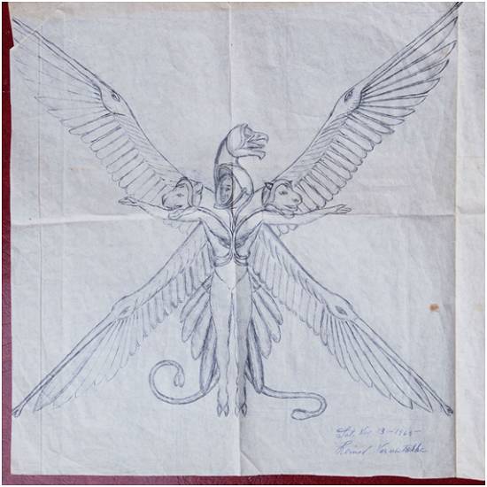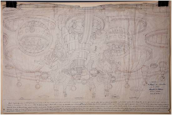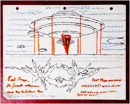 irrelevante, e desenhos de significado indeterminado. Outras imagens que chamam a atenção são esboços de mecanismos não identificados, esboços de óvnis, e desenhos belos e algo sinistros de concepções da visão do profeta bíblico Ezequiel (Ez.