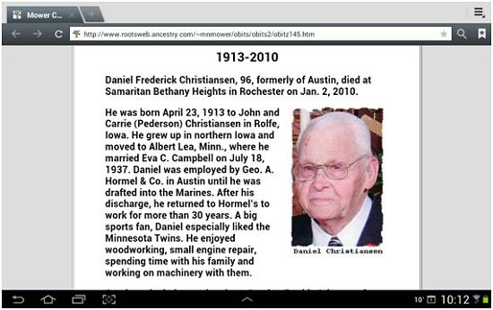 O falecimento de Daniel Christiansen em 2010 é registrado no site Rootsweb.ancestry.com