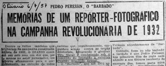 comerciante. Acima de tudo, Pedro Peressin é um valoroso ex-combatente de 19332, que só não combateu mesmo, por que nunca viu inimigo e porque a