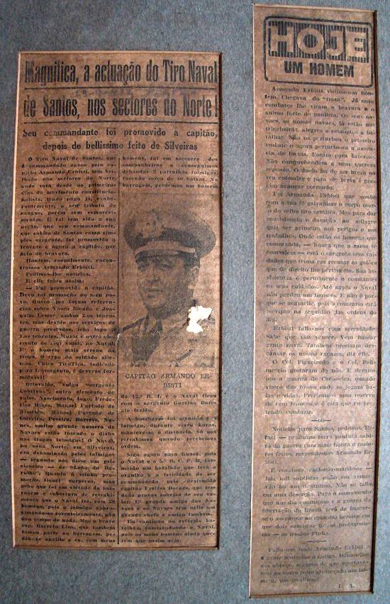 O Tiro Naval de Santos, que é comandado agora pelo capitão Armando Erbisti, tem brilhado nos setores do Norte, onde está desde os primeiros dias do movimento constitucionalista, tendo pago já, exuberantemente, o seu tributo de sangue, porém sem esmorecimentos. E tal tem sido a sua ação, que seu comandante, que saíra de Santos como simples sargento, foi promovido a tenente e agora a capitão, por ato de bravura.